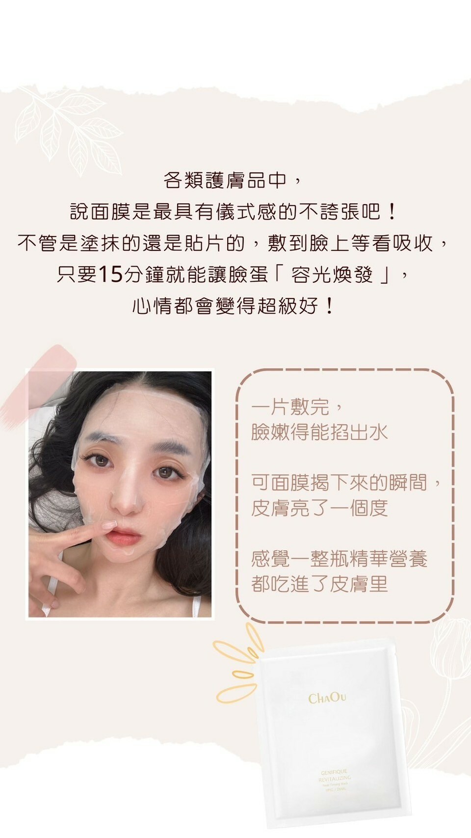 使用方式:敷15分鐘取下面膜後輕拍至精華液吸收即可。